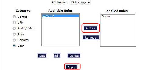 Step 4: Select the name of the rule you just created in the Available Rules box and click Add to use this port forwarding rule on camera. Click Apply.